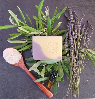 Huile d’olive saponifiée, Huile de coco saponifiée, Beurre de karité saponifié, Huile de tournesol saponifiée, Glycérine, Huile d’olive, Huile de coco, Huile de ricin, saponifiée, Beurre de karité, Huile de graine de tournesol, Argile blanche, Huile essentielle de lavande, Parfum, Huile de ricin, Oxyde violet (colorant violet).
