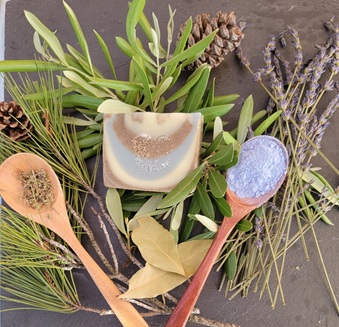 Huile d’olive saponifiée, Huile de coco saponifiée, Beurre de karité saponifié, Huile de tournesol saponifiée, Glycérine, Huile d’amande douce saponifiée, Huile d’olive, Huile de coco, Beurre de karité, Huile de ricin saponifiée, Huile de graine de tournesol, Argile bleu surfine, Essence de Térébenthine, Huile essentielle de lavande, Poudre de feuille de Romarin, Poudre de feuille de thym, Huile d’amande douce, Huile de ricin.